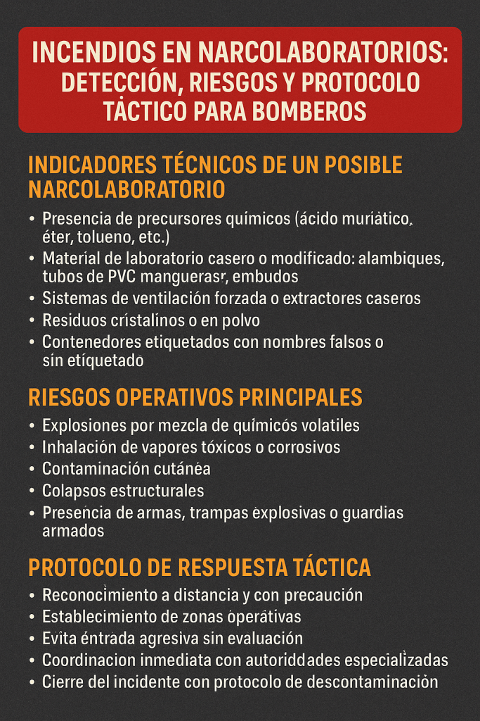 En México y otras zonas de alto riesgo, los narcolaboratorios representan uno de los escenarios más complejos y peligrosos para los cuerpos de emergencia. Estos sitios combinan materiales inflamables, reactivos inestables, estructuras improvisadas y, en muchos casos, amenazas intencionales contra los respondientes.
