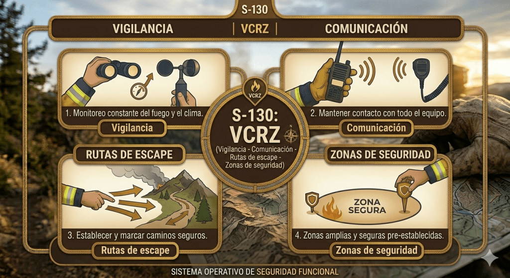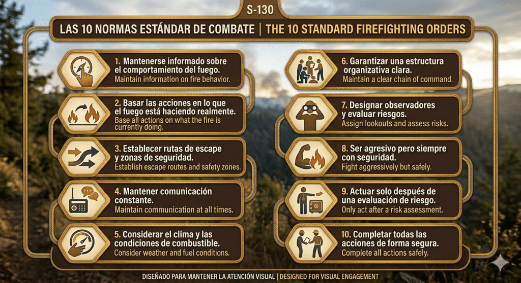 Mantenernos informados sobre el comportamiento del fuego. Basar nuestras acciones en lo que el fuego está haciendo realmente. Establecer rutas de escape y zonas de seguridad antes de iniciar operaciones. Mantener comunicación constante. Combatir el fuego de manera agresiva, pero siempre con seguridad primero.