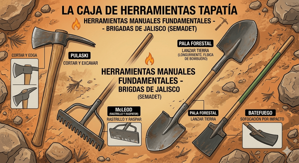 • La Pala Forestal: No es la pala de construcción común. Es más ligera, con punta afilada y bordes cortantes, perfecta para lanzar tierra sobre las llamas (sofocación) y cavar trincheras.