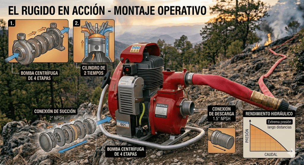 Al mediodía, el sonido cambió al rugido de los motores. Aquí es donde entra la tecnología. Nos presentaron a la leyenda del combate forestal: la bomba MARK-3 de WATERAX. Esta bomba portátil, fabricada en Canadá, es el estándar mundial. Es sorprendente que un motor tan pequeño pueda generar tanta presión (¡hasta 380 PSI!), lo que permite subir agua por pendientes empinadas y llevarla a kilómetros de distancia a través de mangueras. Verla en acción te da confianza; sabes que tienes potencia real para enfriar el incendio.