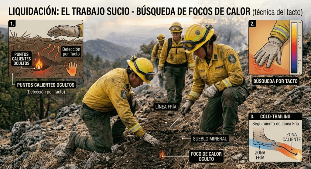 Para cerrar la tarde, nos enfrentamos a la «liquidación» (mop-up), que es esencialmente el trabajo de limpieza final. Se camina por líneas frías buscando puntos calientes, a veces usando el tacto o la vista para identificar brasas ocultas bajo tierra o troncos. Es un trabajo minucioso y sucio, pero crucial para asegurar que el fuego no se reactive horas después de que parezca extinguido.
